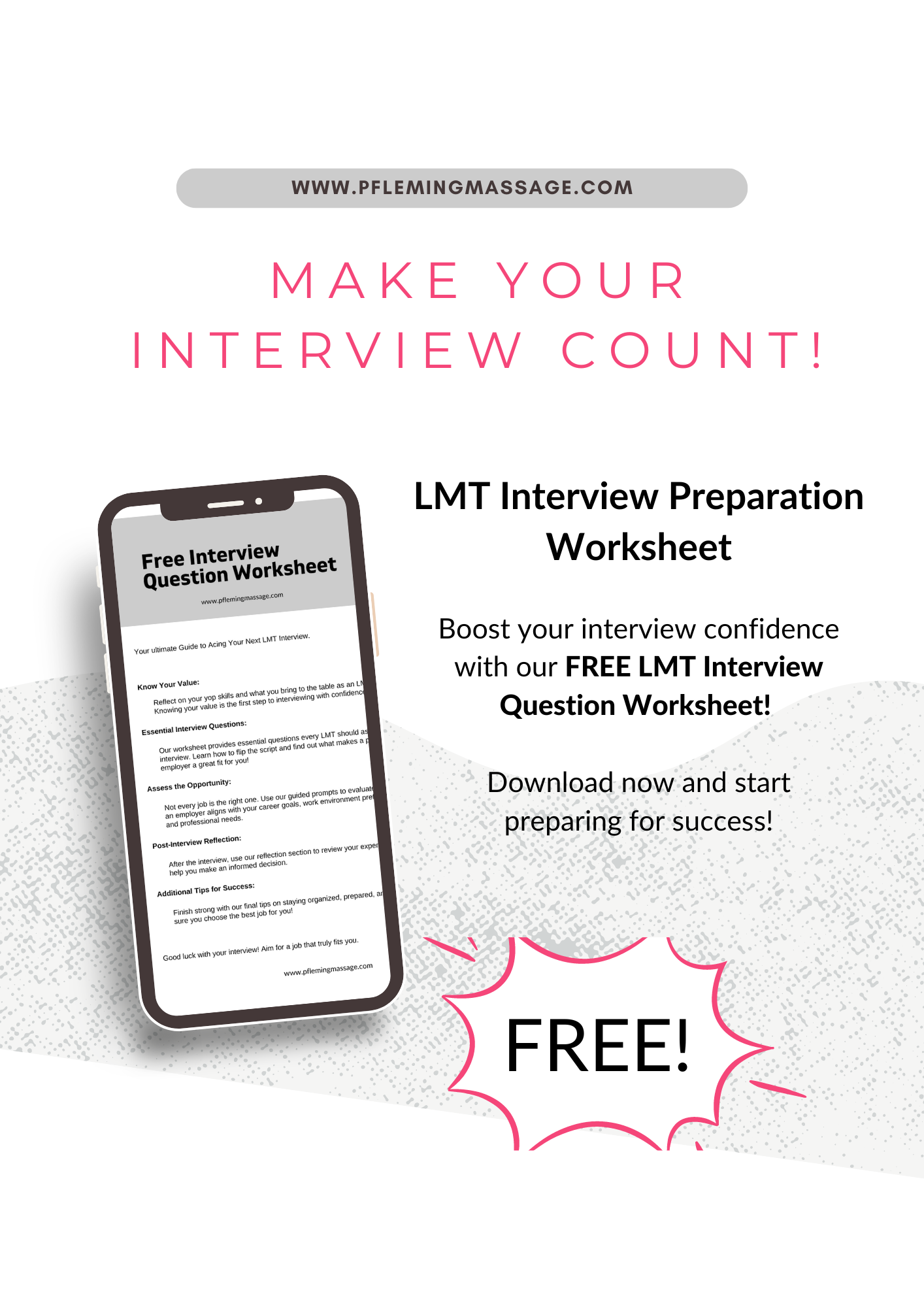 Boost your interview confidence with our FREE LMT Interview Question Worksheet! Tailored specifically for Licensed Massage Therapists, this guide helps you ask the right questions, evaluate potential employers, and reflect on your interview experience. Perfect for both new and seasoned LMTs, it’s your first step toward securing a job that truly fits your career goals. Download now and start preparing for success!